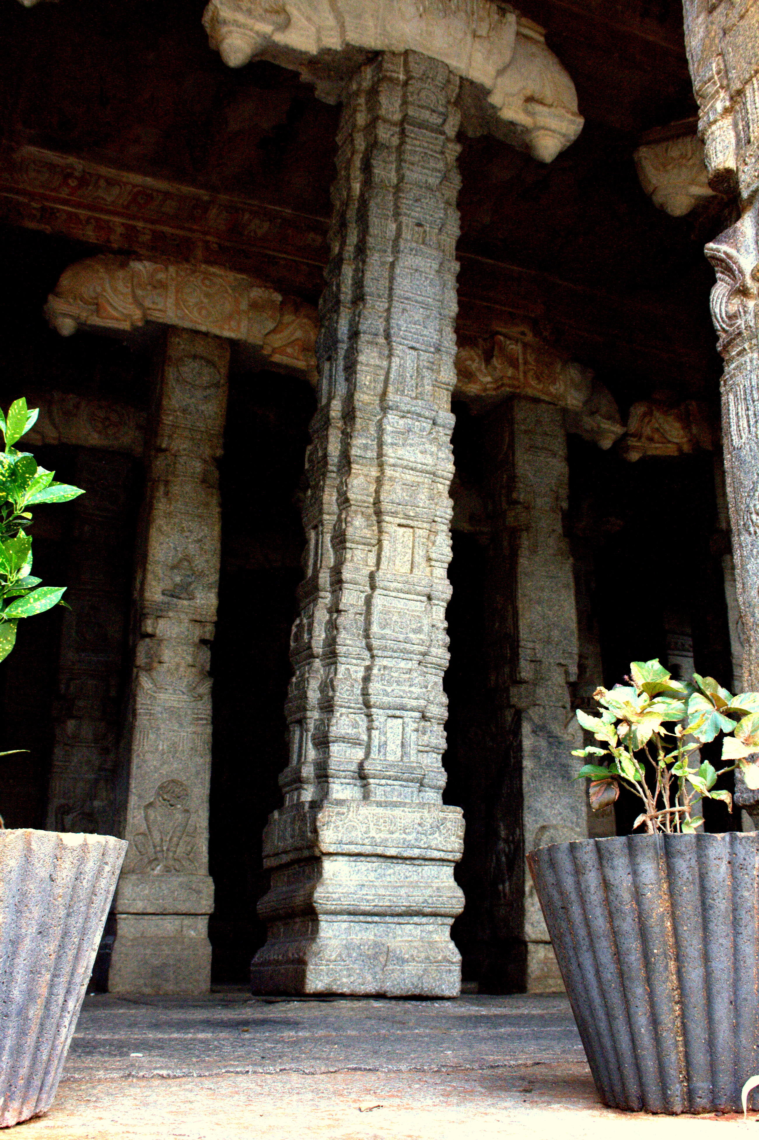 There are two red spots on the western wall of the inner enclosure and it is believed that Virupanna, the treasurer of the Vijayanagar empire was accused of using the funds without kings permission to build these monuments and build mantapam behind the temple. When the construction was almost complete the king realized that he has used the treasure without his permission and ordered a punishment to be blinded.